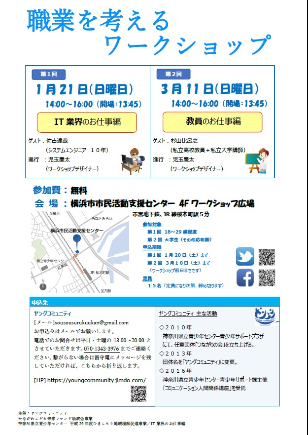 学校・会社・家、以外で集まる居場所(コミュニティ)創りをテーマとした毎月の活動やお知らせ等を載せています。横浜や湘南地区で主に動いています。2010年~。