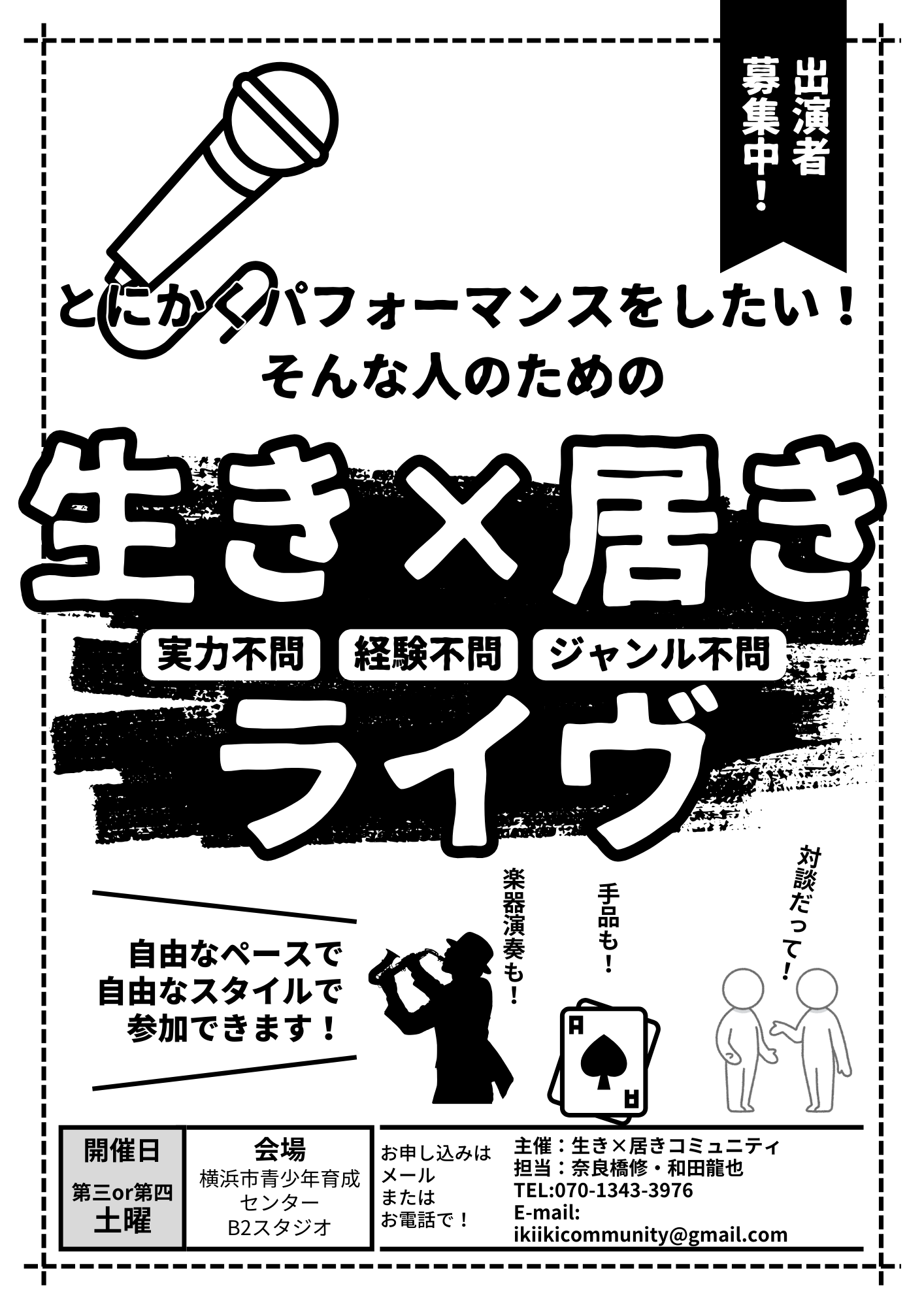人前で唄ったり、演奏したり、踊ったり、語ったりしたい方が実績等に関係なく気軽に楽しんで頂けるライヴイベントです。 以下詳細になります。 【日時】7月20日(日)