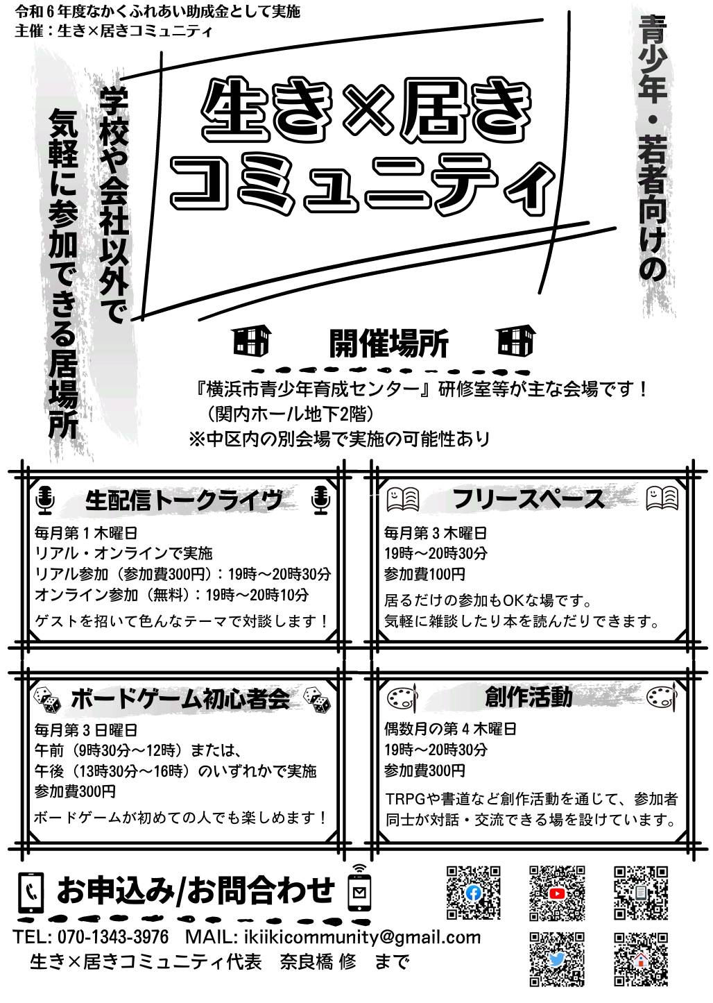 青少年交流ひろばさくらリビングHP https://yokohama-youth.jp/kkspace/ 事前申込み不要です。 生き×居きコミュニティホームページ http://ty-asobiba.xyz/ikiikicommunity/ 生き×居きコミュニティブログ http://tsudoi.blog-rpg.com/ 連絡先 メール:ikiikicommunity@gmail.com 電話:07013433976