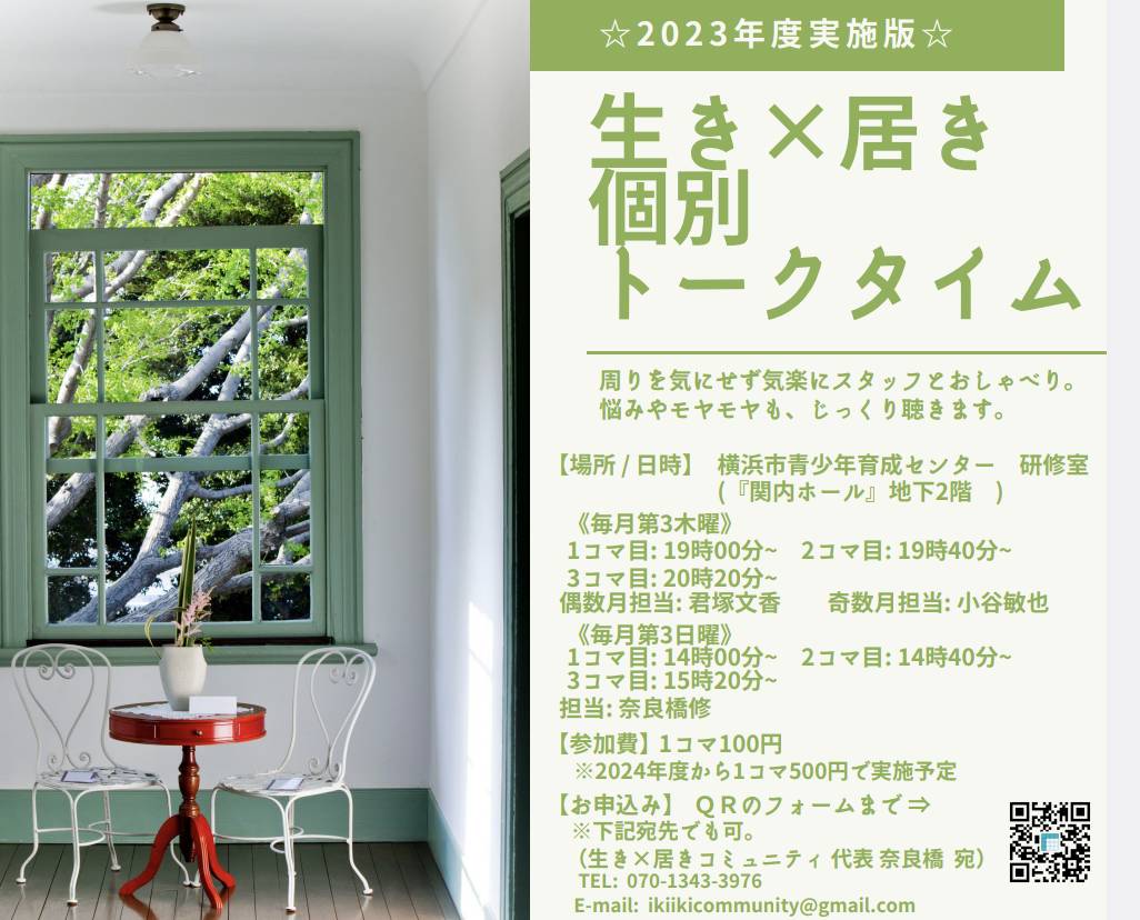 【生き×居き個別トークタイム】という名称にて個別にお話出来る機会を設けます。 居場所や交流スペースとは違った個別にお話しする機会として名称は変われどやり方はこれ迄通り実施致します。