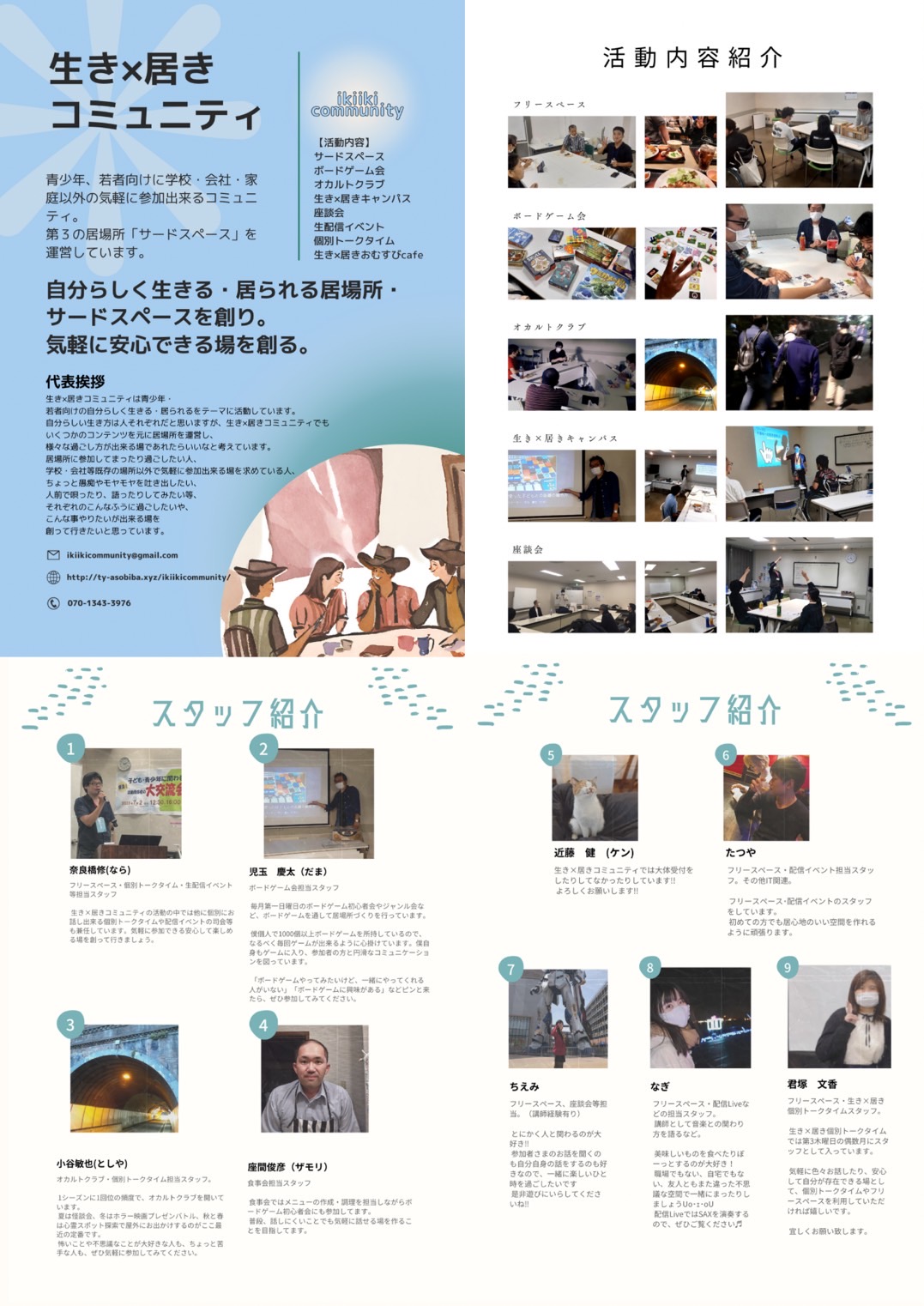 ご参加申し込み:開催日の前日迄に以下に電話またはメールにてご連絡お願いします。 ikiikicommunity@gmail.com お申し込み例 タイトル『1月⚪⚪』 本文『お名前』 タイトルに参加したい催し名 (複数同時に申込も可能です) 本文にお名前をご記載下さい。 またご友人の方などいらっしゃる場合は人数の方もご記載下さい。 電話:07013433976 (火、水、木、土:15時~20時、活動開催日の日曜) 出れない場合もあるので留守電頂ければ折り返しご対応させて頂きます。 仮に当日急に参加したくなった(出来るようになった)場合も必ずご連絡下さい。 当日の場合お電話の方が助かります。 定員になり次第締め切らせて頂きますがご了承下さい! 生き×居きコミュニティブログ http://tsudoi.blog-rpg.com/ 生き×居きコミュニティ 奈良橋